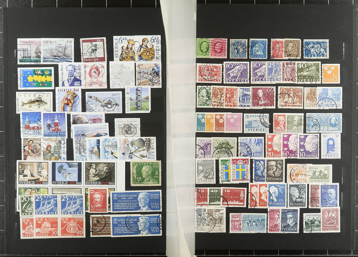 Collection / accumulation of used Sweden, 1858-2008, containing roughly 1,700 stamps in a well organized stockbook and a few stock pages. The lot generally ranges from Scott #8/2578, along with selections of back of the book material, coils, booklet stamps, etc. Owner's 2013 Scott catalogue value for the lot totals US$1,283.00 ($1732.05 CDN), leaving better finds for the dedicated collector. Postmark interest includes cds and bridge types, including several "socked on the nose" town cancels. A nicely organized lot, with duplication up to 5 for some issues, overall fine to very fine. Estimate =