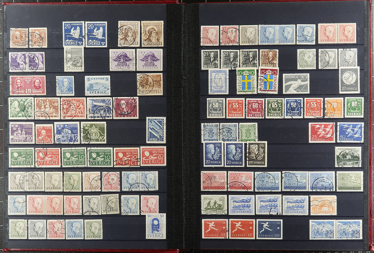 Collection / accumulation of used Sweden, 1858-2008, containing roughly 1,700 stamps in a well organized stockbook and a few stock pages. The lot generally ranges from Scott #8/2578, along with selections of back of the book material, coils, booklet stamps, etc. Owner's 2013 Scott catalogue value for the lot totals US$1,283.00 ($1732.05 CDN), leaving better finds for the dedicated collector. Postmark interest includes cds and bridge types, including several "socked on the nose" town cancels. A nicely organized lot, with duplication up to 5 for some issues, overall fine to very fine. Estimate =