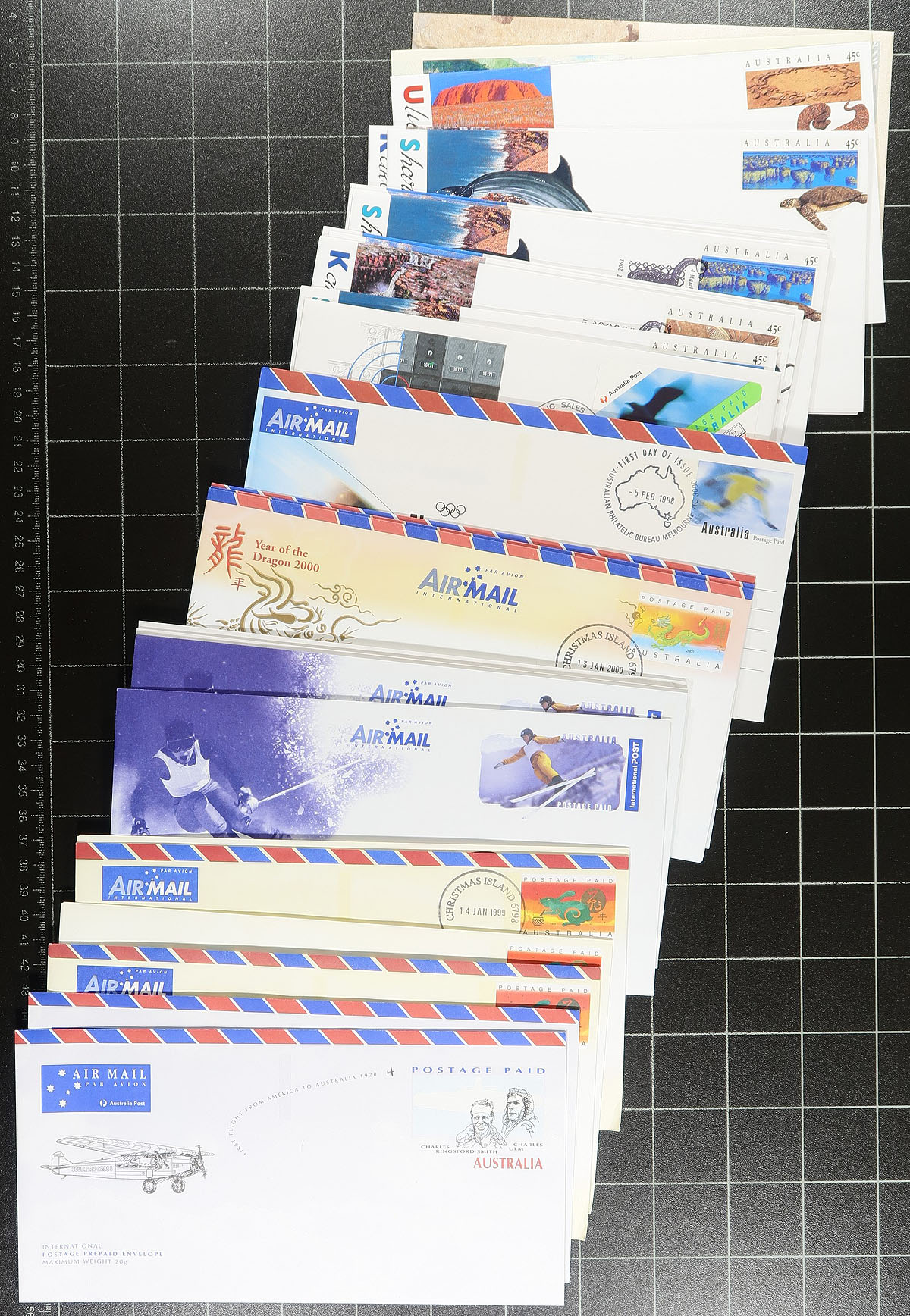 Nice collection / accumulation of mint and used Australia postal stationery. The lot contains roughly 250 items, primarily ranging from the 1990'-s, with some issues having an unused and first day cancellation. We note a variety of envelope types and sizes, making this a nice lot for the postal stationery collector. A very clean lot. Estimate =