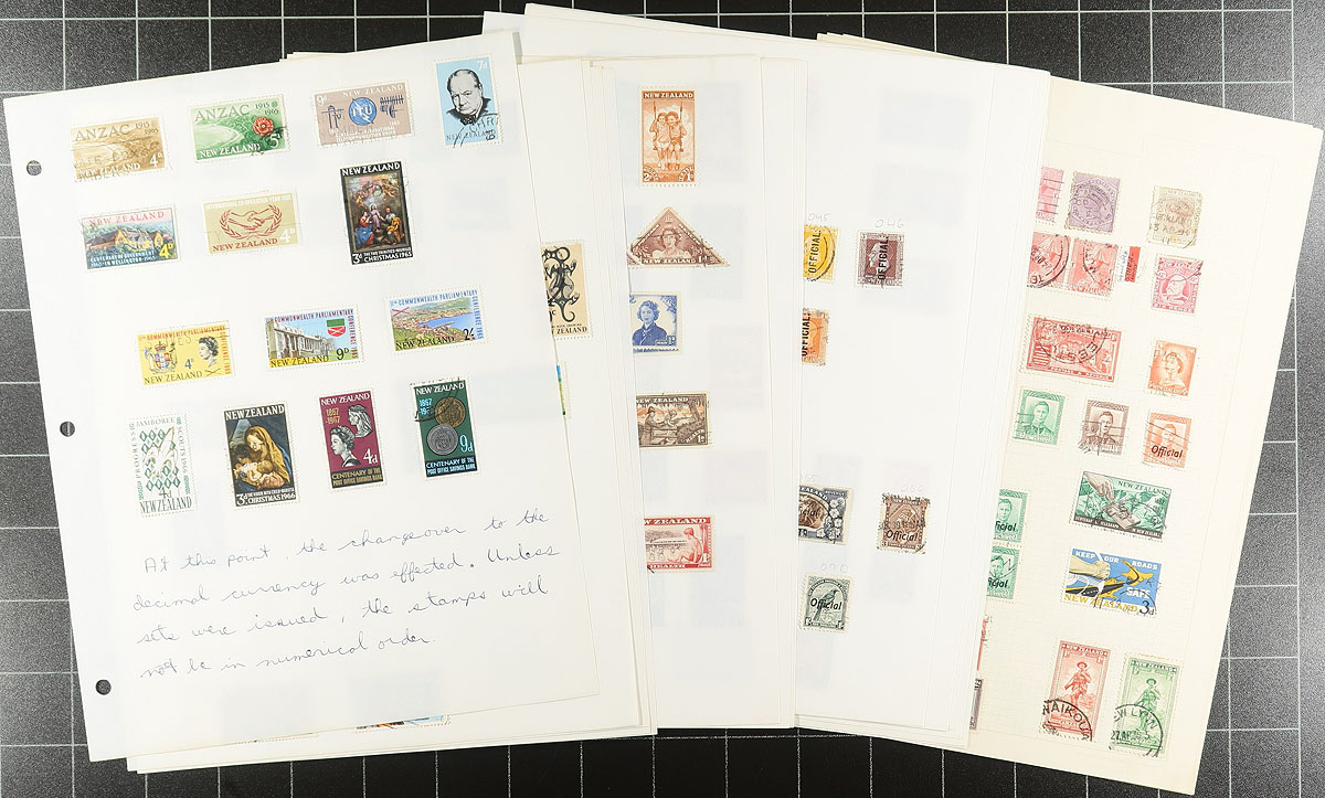 Collection / accumulation of used New Zealand, 1882-2001, containing roughly 2,500 stamps in over 35 stock or album pages. The lot generally ranges from Scott #61/1755, including a good selection of back of the book issues, a few advertising backed stamps, and more. A spot check indicated singles, sets, and partial sets cataloguing $10 and up each, including #165-170 Victory set (used, c.v. $101). Owner's 2003 Scott catalogue value for the lot totals US$1,516.00 ($2046.60 CDN), leaving finds for the dedicated collector. A few faults noted with a few of the early stamps, with duplication up to three for some issues, overall fine to very fine. Estimate =