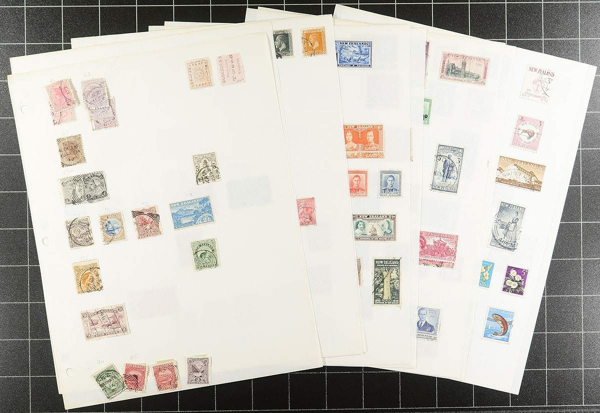 Collection / accumulation of used New Zealand, 1882-2001, containing roughly 2,500 stamps in over 35 stock or album pages. The lot generally ranges from Scott #61/1755, including a good selection of back of the book issues, a few advertising backed stamps, and more. A spot check indicated singles, sets, and partial sets cataloguing $10 and up each, including #165-170 Victory set (used, c.v. $101). Owner's 2003 Scott catalogue value for the lot totals US$1,516.00 ($2046.60 CDN), leaving finds for the dedicated collector. A few faults noted with a few of the early stamps, with duplication up to three for some issues, overall fine to very fine. Estimate =