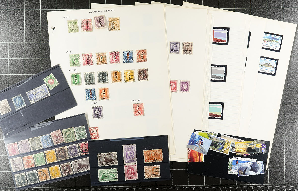 Collection / accumulation of used New Zealand, 1882-2001, containing roughly 2,500 stamps in over 35 stock or album pages. The lot generally ranges from Scott #61/1755, including a good selection of back of the book issues, a few advertising backed stamps, and more. A spot check indicated singles, sets, and partial sets cataloguing $10 and up each, including #165-170 Victory set (used, c.v. $101). Owner's 2003 Scott catalogue value for the lot totals US$1,516.00 ($2046.60 CDN), leaving finds for the dedicated collector. A few faults noted with a few of the early stamps, with duplication up to three for some issues, overall fine to very fine. Estimate =