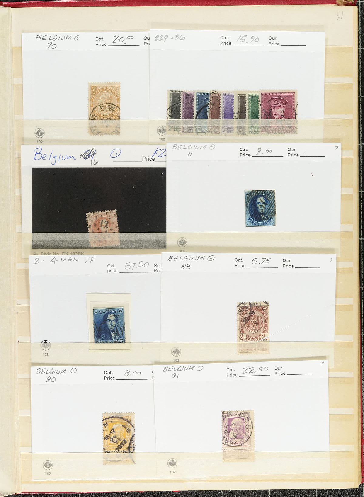 Accumulation of used Belgium, 1849-2000, containing a few thousand stamps in a stockbook and several album pages. A cursory check of material indicates a range from Scott #2/1783, including a good range of parcel post issues, occupations and other back of the book stamps. We spotted a few better stamps including #s 2, 16, 70, 91, 98, 224, along with other singles, sets, and partial sets cataloguing $10 to $20 and up. Postmark interest includes cds, double ring, bridge, and a few other types, noting several "socked on the nose" town cancels. A nice lot for the Belgium or worldwide collector, with duplication up to 5 for some issues, overall fine to very fine. Estimate =