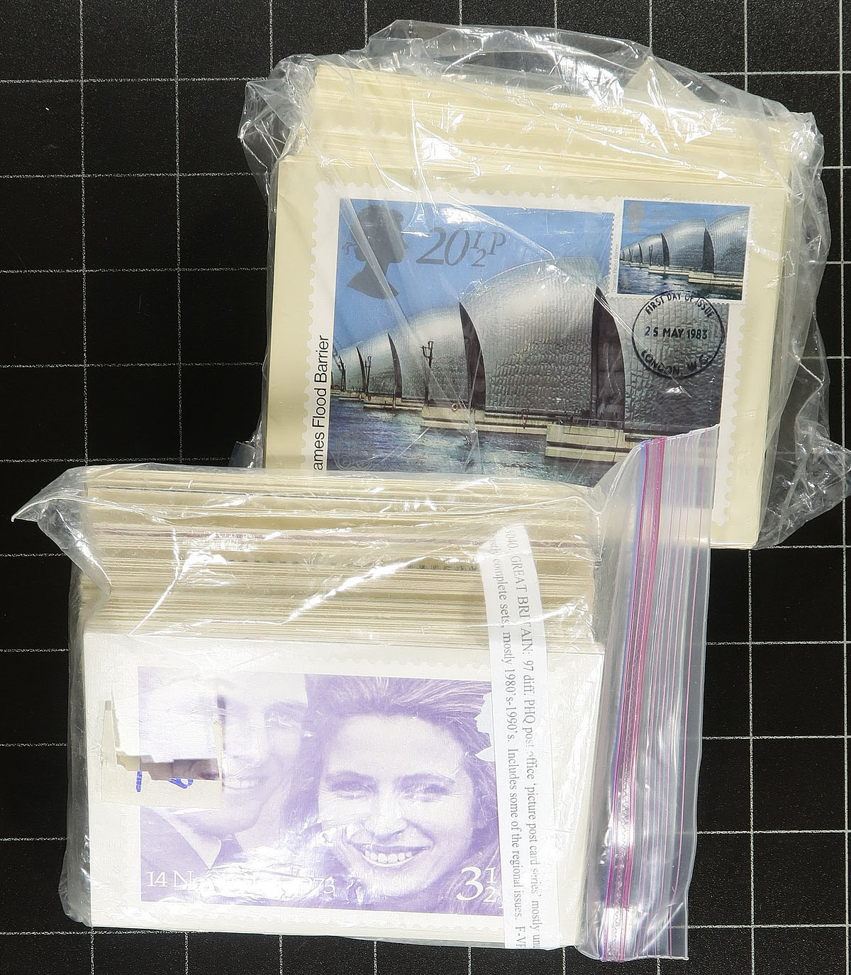 "P.H.Q" cards. Nice collection of many hundreds P.H.Q. post office "picture post cards", 1973-2000's, primarily with the first day of issue cancellations. We note a few better cards including the first two issues (larger card size, Cricket and Inigo Jones issues, PHQ1-2, SG c.v. £130 total), PHQ12 (Public Railways set, £30), and a few other sets cataloguing £5 and up. A nice lot for the post card or first day cover collector, and an often overlooked and under appreciated area of philately. Duplication possible for some sets, overall fine to very fine. Estimate =