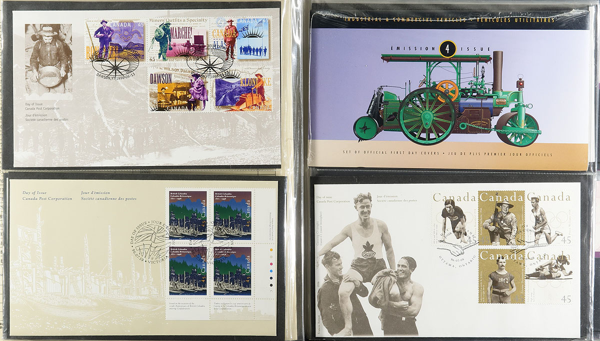 First Day Cover Collection. Lovely collection of roughly 400 first day covers in 5 albums, 1990-2005, noting singles, plate blocks, souvenir sheet, and high denomination frankings. A nice group that includes $5.00 Moose (x2), Fruit Tree definitives, and a complete set of Millenium issues. Colourful and very fine. Estimate =