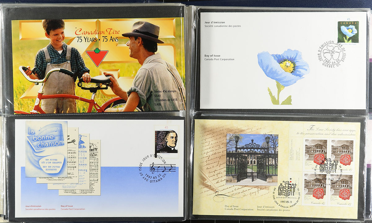 First Day Cover Collection. Lovely collection of roughly 400 first day covers in 5 albums, 1990-2005, noting singles, plate blocks, souvenir sheet, and high denomination frankings. A nice group that includes $5.00 Moose (x2), Fruit Tree definitives, and a complete set of Millenium issues. Colourful and very fine. Estimate =