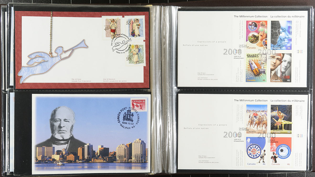 First Day Cover Collection. Lovely collection of roughly 400 first day covers in 5 albums, 1990-2005, noting singles, plate blocks, souvenir sheet, and high denomination frankings. A nice group that includes $5.00 Moose (x2), Fruit Tree definitives, and a complete set of Millenium issues. Colourful and very fine. Estimate =