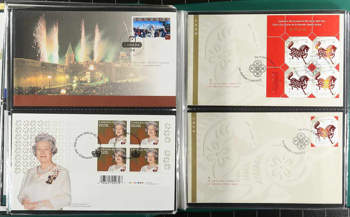 First Day Cover Collection. Lovely collection of roughly 400 first day covers in 5 albums, 1990-2005, noting singles, plate blocks, souvenir sheet, and high denomination frankings. A nice group that includes $5.00 Moose (x2), Fruit Tree definitives, and a complete set of Millenium issues. Colourful and very fine. Estimate =