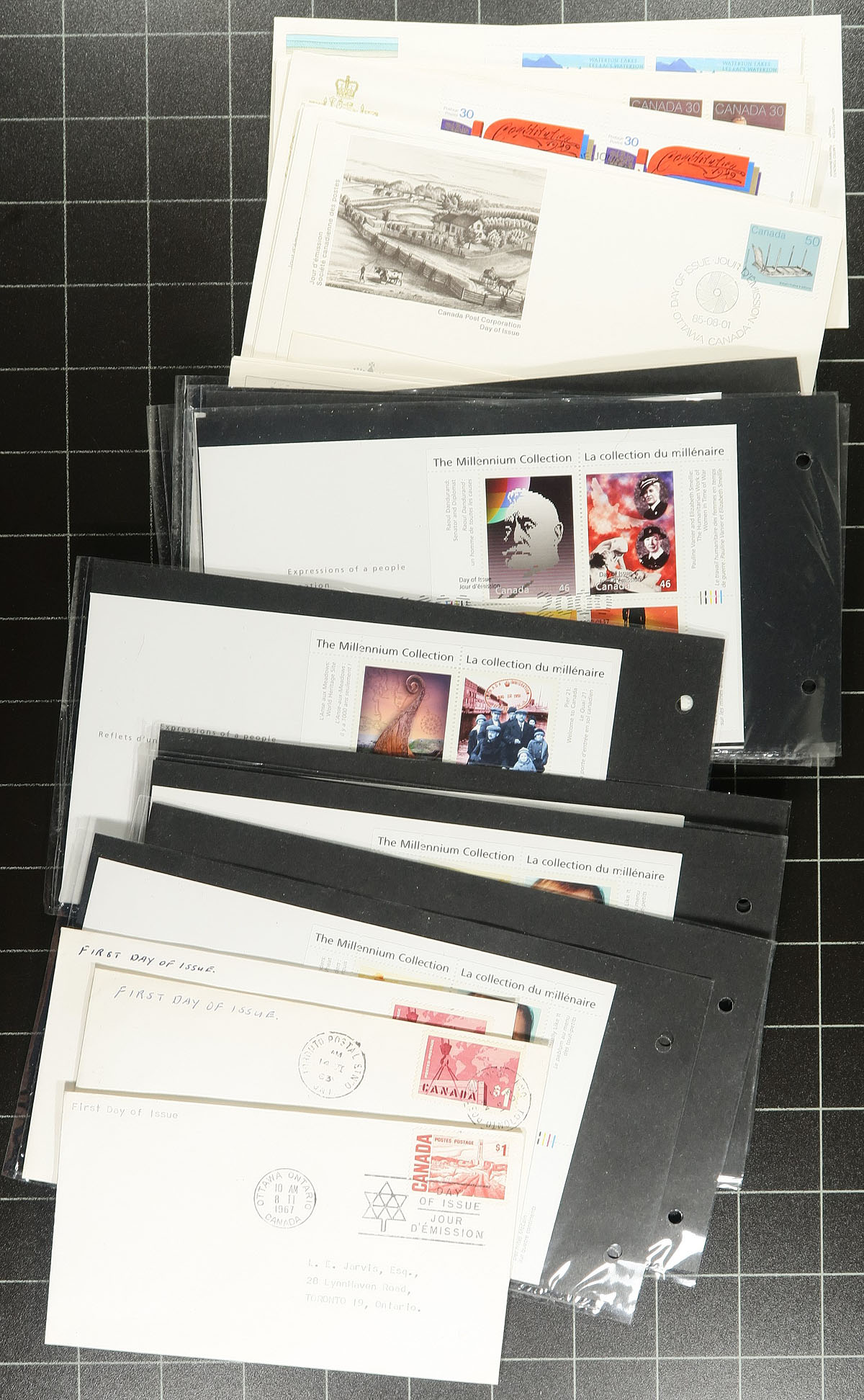 First Day Covers. Collection / Accumulation of roughly 600 first day covers in a box, 1940's-1999. The lot has a little bit of everything, noting a few hundred uncacheted first days from the 1940's to the 1950's, a selection of private cachet covers, and modern covers noting singles, sets, plate blocks, souvenir sheet, and high denomination frankings. A spot check indicated some covers cataloguing $10.00 and up, including a nice selection of singles, set, and plate block frankings from the popular Regiments issues. A nice lot for the cover collector or dealer looking for stock. Estimate =