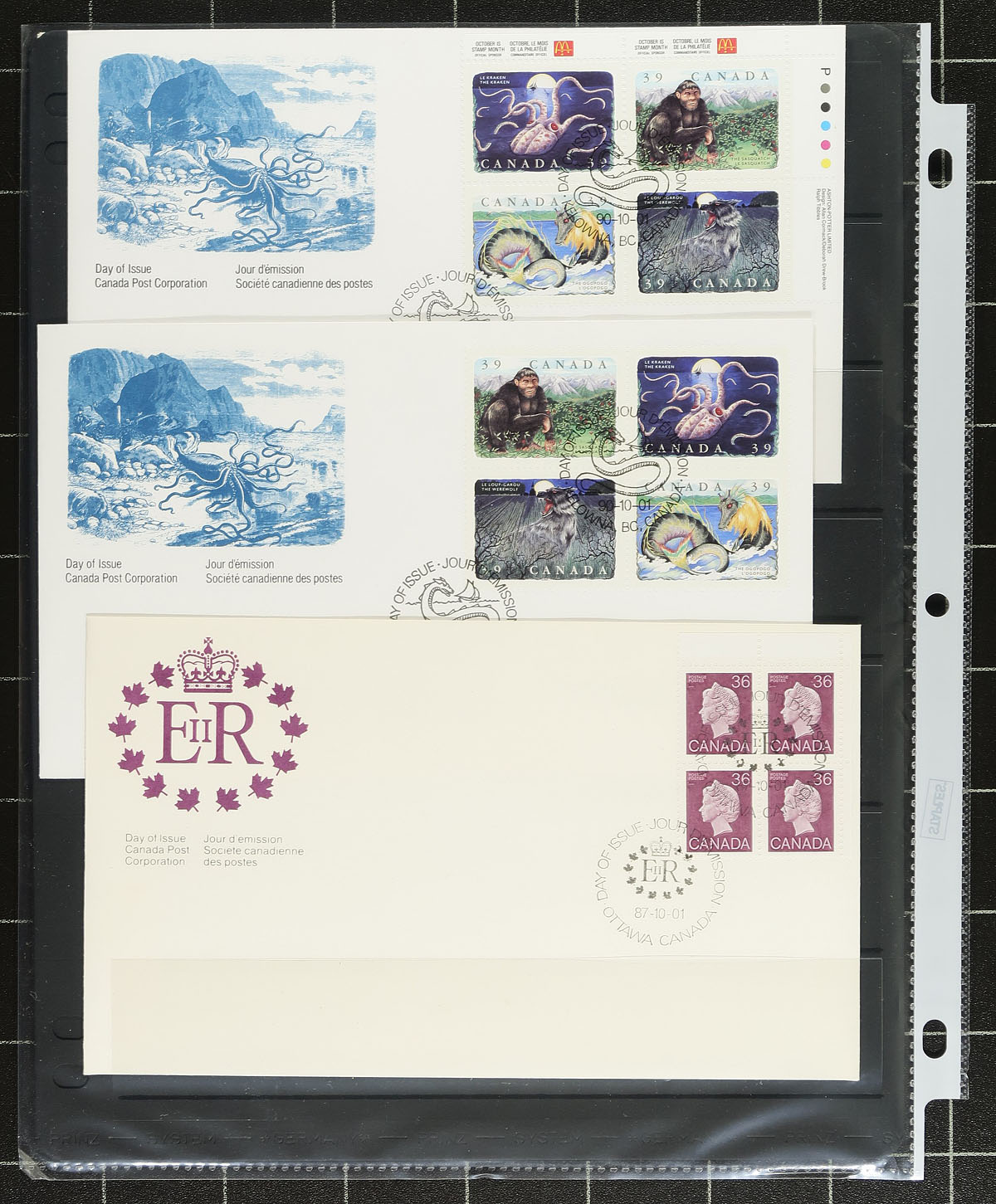 First Day Covers. Collection / Accumulation of roughly 600 first day covers in a box, 1940's-1999. The lot has a little bit of everything, noting a few hundred uncacheted first days from the 1940's to the 1950's, a selection of private cachet covers, and modern covers noting singles, sets, plate blocks, souvenir sheet, and high denomination frankings. A spot check indicated some covers cataloguing $10.00 and up, including a nice selection of singles, set, and plate block frankings from the popular Regiments issues. A nice lot for the cover collector or dealer looking for stock. Estimate =