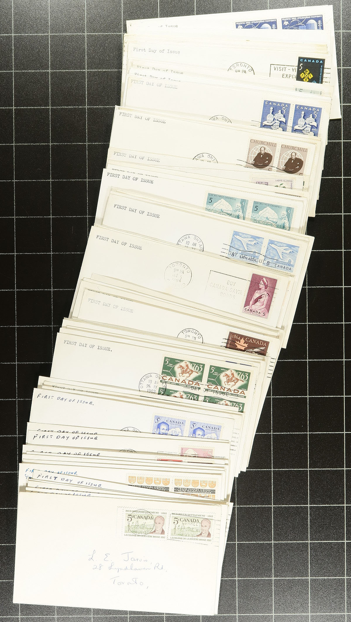 First Day Covers. Collection / Accumulation of roughly 600 first day covers in a box, 1940's-1999. The lot has a little bit of everything, noting a few hundred uncacheted first days from the 1940's to the 1950's, a selection of private cachet covers, and modern covers noting singles, sets, plate blocks, souvenir sheet, and high denomination frankings. A spot check indicated some covers cataloguing $10.00 and up, including a nice selection of singles, set, and plate block frankings from the popular Regiments issues. A nice lot for the cover collector or dealer looking for stock. Estimate =