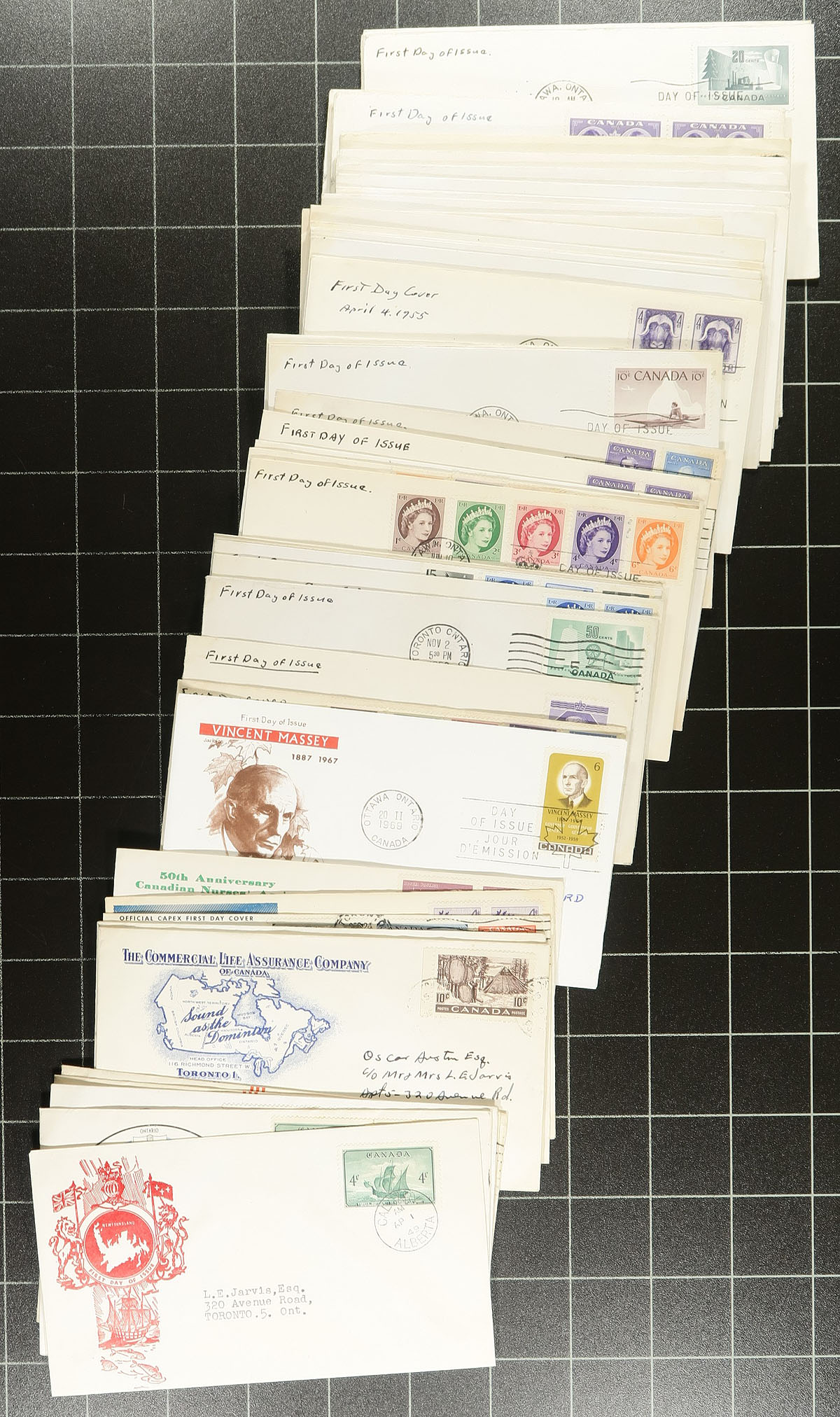 First Day Covers. Collection / Accumulation of roughly 600 first day covers in a box, 1940's-1999. The lot has a little bit of everything, noting a few hundred uncacheted first days from the 1940's to the 1950's, a selection of private cachet covers, and modern covers noting singles, sets, plate blocks, souvenir sheet, and high denomination frankings. A spot check indicated some covers cataloguing $10.00 and up, including a nice selection of singles, set, and plate block frankings from the popular Regiments issues. A nice lot for the cover collector or dealer looking for stock. Estimate =