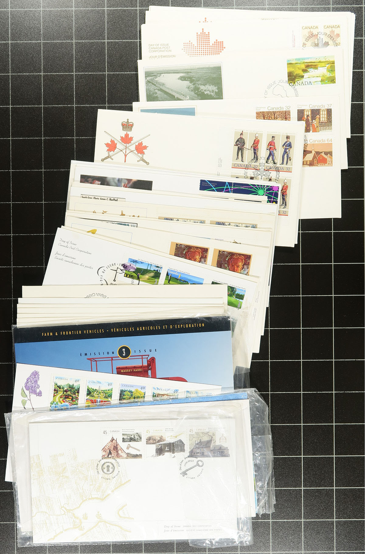 First Day Covers. Collection / Accumulation of roughly 600 first day covers in a box, 1940's-1999. The lot has a little bit of everything, noting a few hundred uncacheted first days from the 1940's to the 1950's, a selection of private cachet covers, and modern covers noting singles, sets, plate blocks, souvenir sheet, and high denomination frankings. A spot check indicated some covers cataloguing $10.00 and up, including a nice selection of singles, set, and plate block frankings from the popular Regiments issues. A nice lot for the cover collector or dealer looking for stock. Estimate =