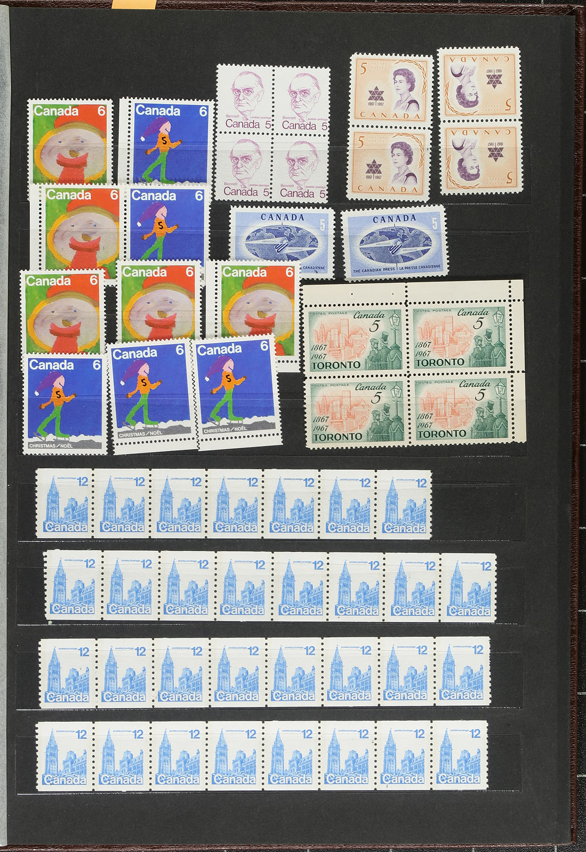 Group of 5 Canada Collections in a box, 1850's-1995, containing well over 1,000 stamps in total. A cursory check of material indicated a small selection of pre-1930's used stamps, with strength in Elizabethan issues noting mint and or used singles, blocks, coils, souvenir sheets, and "back of the book" issues. We note a few stamps cataloguing $10 and up, with face value probably over $200 alone. A nice starter group for the Canada collector, with very usable face value postage, overall fine to very fine. Estimate =