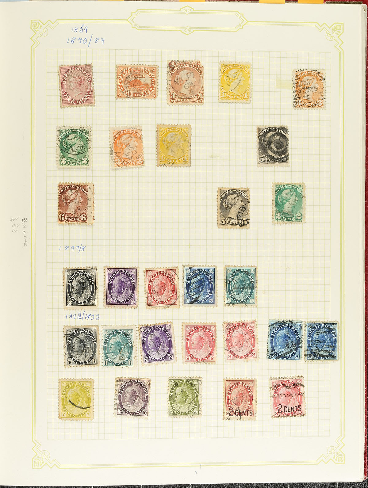 Group of 5 Canada Collections in a box, 1850's-1995, containing well over 1,000 stamps in total. A cursory check of material indicated a small selection of pre-1930's used stamps, with strength in Elizabethan issues noting mint and or used singles, blocks, coils, souvenir sheets, and "back of the book" issues. We note a few stamps cataloguing $10 and up, with face value probably over $200 alone. A nice starter group for the Canada collector, with very usable face value postage, overall fine to very fine. Estimate =