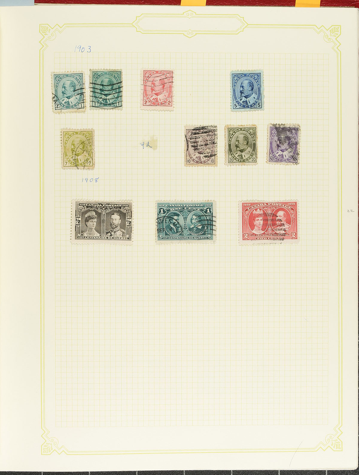 Group of 5 Canada Collections in a box, 1850's-1995, containing well over 1,000 stamps in total. A cursory check of material indicated a small selection of pre-1930's used stamps, with strength in Elizabethan issues noting mint and or used singles, blocks, coils, souvenir sheets, and "back of the book" issues. We note a few stamps cataloguing $10 and up, with face value probably over $200 alone. A nice starter group for the Canada collector, with very usable face value postage, overall fine to very fine. Estimate =