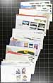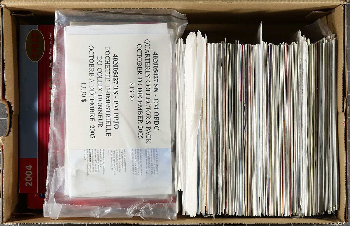First Day Covers. Lovely group of modern Canada first day covers 1997-2010, containing roughly 300 covers and includes a 2003 and 2004 collection in original packaging, and sealed 2007 collection in a wooden box (original retail price for all 3 totals $209.78), along with singles, sets, plate blocks, souvenir sheet, and high denomination frankings. A very clean group for collectors and dealers alike. Estimate =