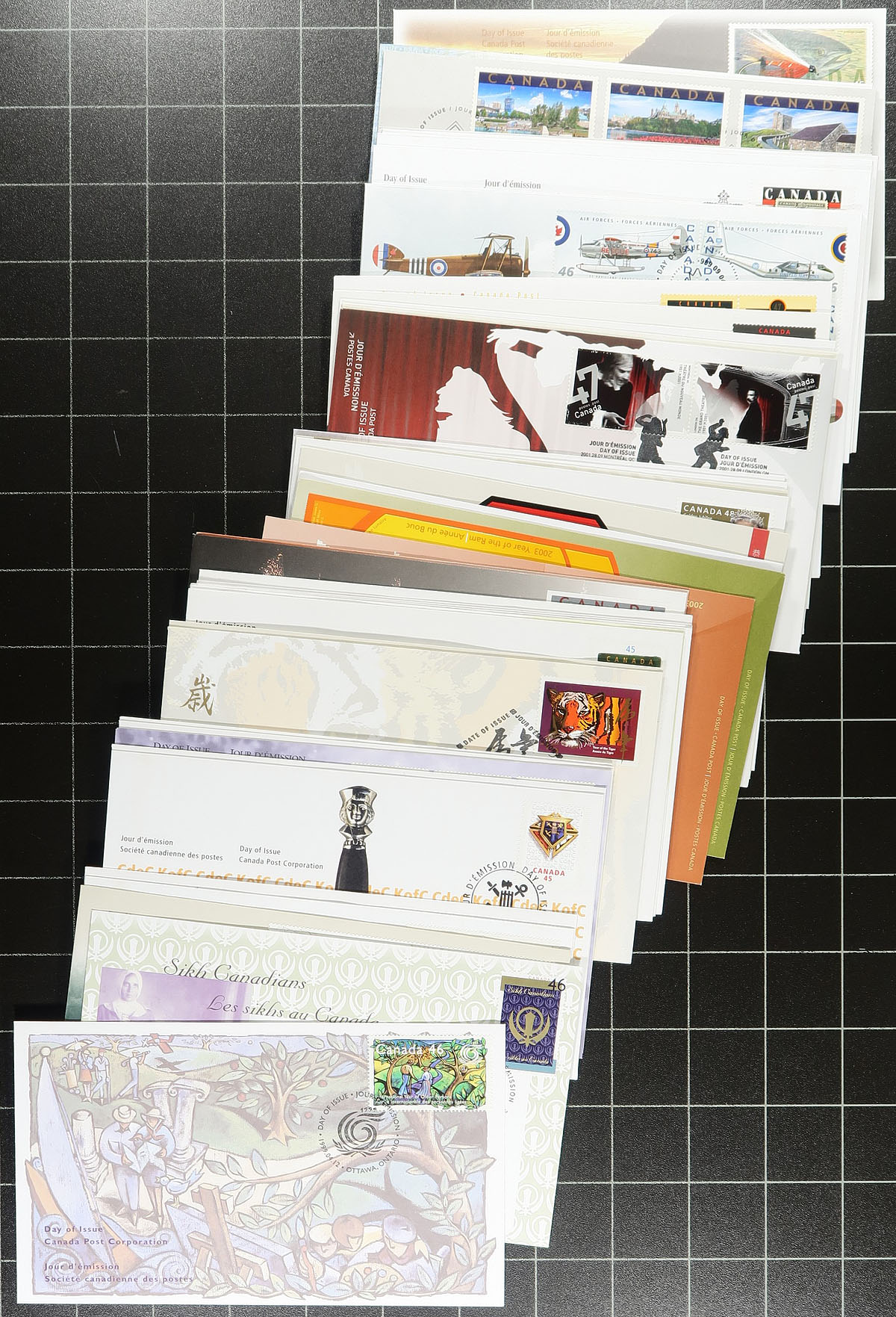First Day Covers. Lovely group of modern Canada first day covers 1997-2010, containing roughly 300 covers and includes a 2003 and 2004 collection in original packaging, and sealed 2007 collection in a wooden box (original retail price for all 3 totals $209.78), along with singles, sets, plate blocks, souvenir sheet, and high denomination frankings. A very clean group for collectors and dealers alike. Estimate =