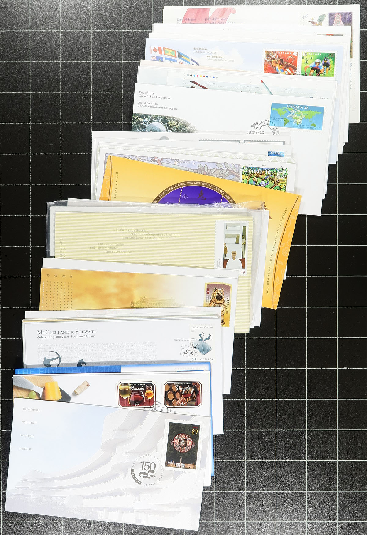 First Day Covers. Lovely group of modern Canada first day covers 1997-2010, containing roughly 300 covers and includes a 2003 and 2004 collection in original packaging, and sealed 2007 collection in a wooden box (original retail price for all 3 totals $209.78), along with singles, sets, plate blocks, souvenir sheet, and high denomination frankings. A very clean group for collectors and dealers alike. Estimate =
