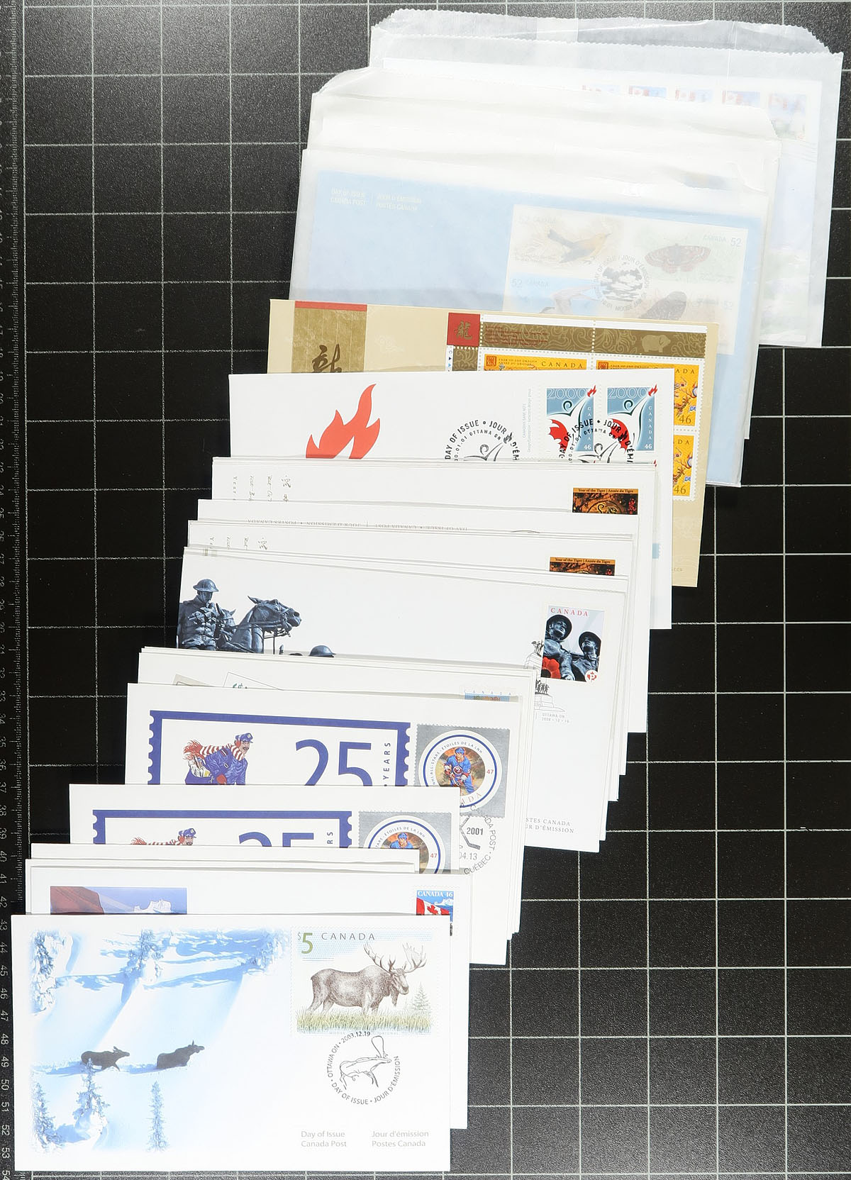 First Day Covers. Lovely group of modern Canada first day covers 1997-2010, containing roughly 300 covers and includes a 2003 and 2004 collection in original packaging, and sealed 2007 collection in a wooden box (original retail price for all 3 totals $209.78), along with singles, sets, plate blocks, souvenir sheet, and high denomination frankings. A very clean group for collectors and dealers alike. Estimate =