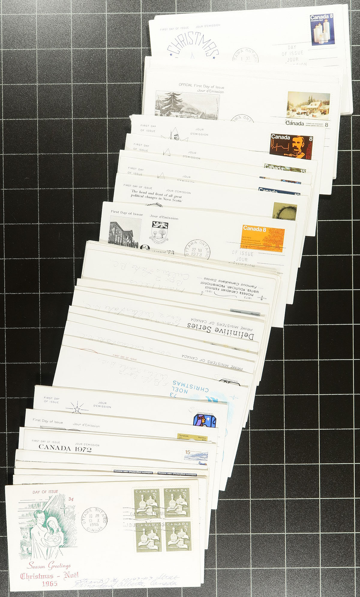 First Day Covers. Great group of private cachet first day covers in a shoebox, 1950's-1972. The lot contains roughly 500 covers in total, mostly single frankings with a few blocks and other frankings, noting private cachet makers Rose Craft, H & E, Capital, Cole, and perhaps a few more with duplication up to 3 for a few issues. A few corner bends on a few covers, still a nice lot for collectors and dealers alike. Estimate =