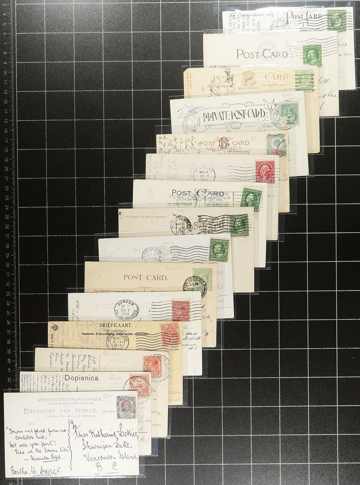 Very interesting group of roughly 60 worldwide postcards franked with private perfins, 1900-1920. We note the majority of postcards are from the United States and Great Britain, along with a few from Netherlands, Canada, and a few others. A good variety of patterns, almost all from the classic postcard era, with only a few beyond the given year range. A nice collection that took a good deal of time to put together, and retails $3 to $10 each, ideal for the specialist or dealer looking for stock, overall fine to very fine. Estimate =