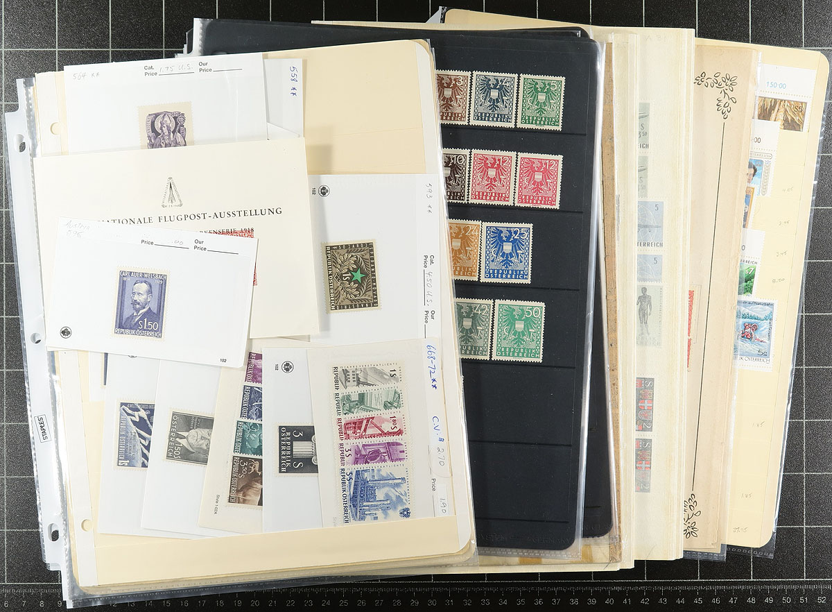 Collection / accumulation of mint Austria, 1918-1993, containing roughly 1,200 stamps in several stock pages. The lot generally ranges from Scott #181/1632, noting several sets (some in 102 cards), and selections of back of the book material. Owner's 2010 Scott catalogue value for the lot totals US$592.00 ($799.20 CDN). A nice starter group for the Austria or worldwide collector, some mild duplication for some issues, overall very fine. Estimate =
