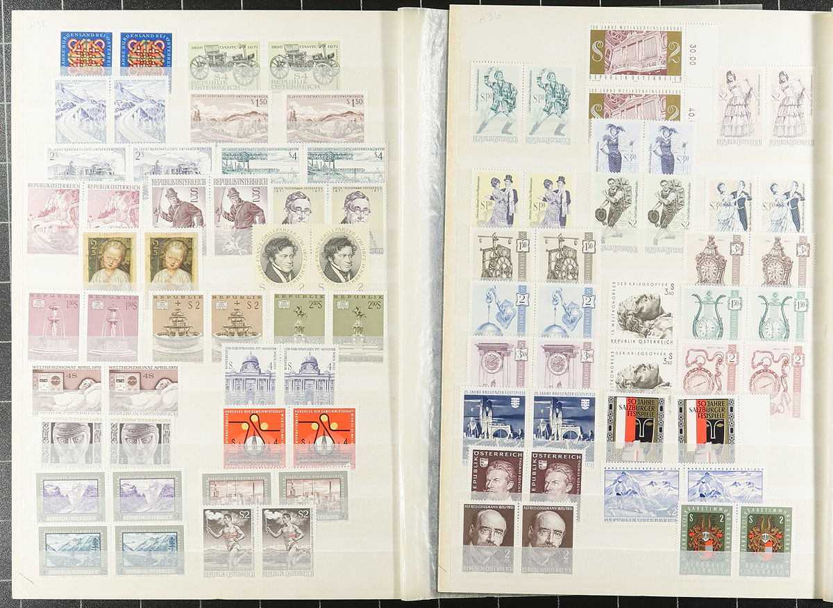 Collection / accumulation of mint Austria, 1918-1993, containing roughly 1,200 stamps in several stock pages. The lot generally ranges from Scott #181/1632, noting several sets (some in 102 cards), and selections of back of the book material. Owner's 2010 Scott catalogue value for the lot totals US$592.00 ($799.20 CDN). A nice starter group for the Austria or worldwide collector, some mild duplication for some issues, overall very fine. Estimate =