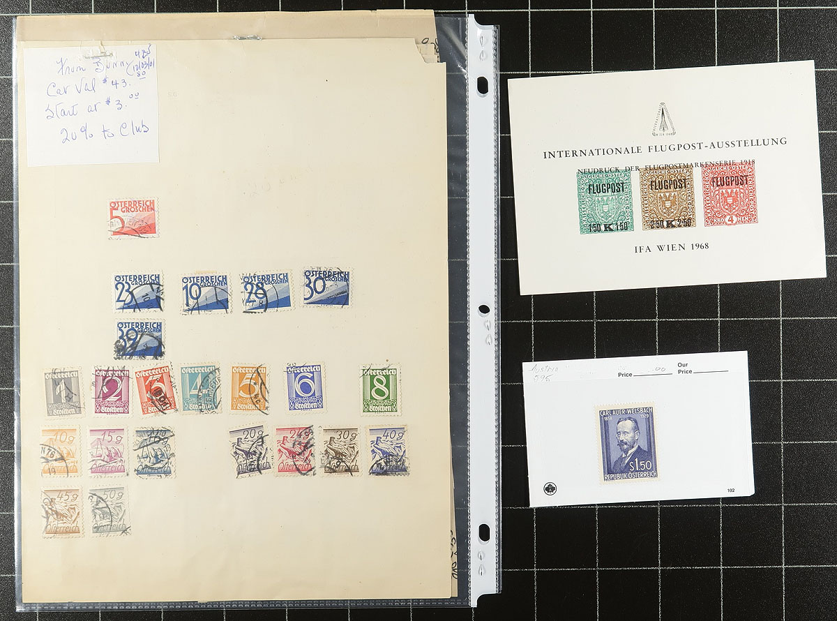 Collection / accumulation of mint Austria, 1918-1993, containing roughly 1,200 stamps in several stock pages. The lot generally ranges from Scott #181/1632, noting several sets (some in 102 cards), and selections of back of the book material. Owner's 2010 Scott catalogue value for the lot totals US$592.00 ($799.20 CDN). A nice starter group for the Austria or worldwide collector, some mild duplication for some issues, overall very fine. Estimate =