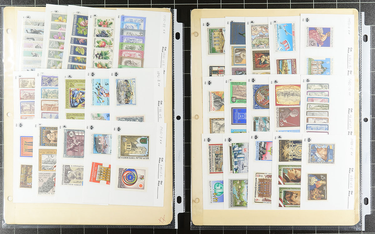 Collection / accumulation of mint Austria, 1918-1993, containing roughly 1,200 stamps in several stock pages. The lot generally ranges from Scott #181/1632, noting several sets (some in 102 cards), and selections of back of the book material. Owner's 2010 Scott catalogue value for the lot totals US$592.00 ($799.20 CDN). A nice starter group for the Austria or worldwide collector, some mild duplication for some issues, overall very fine. Estimate =
