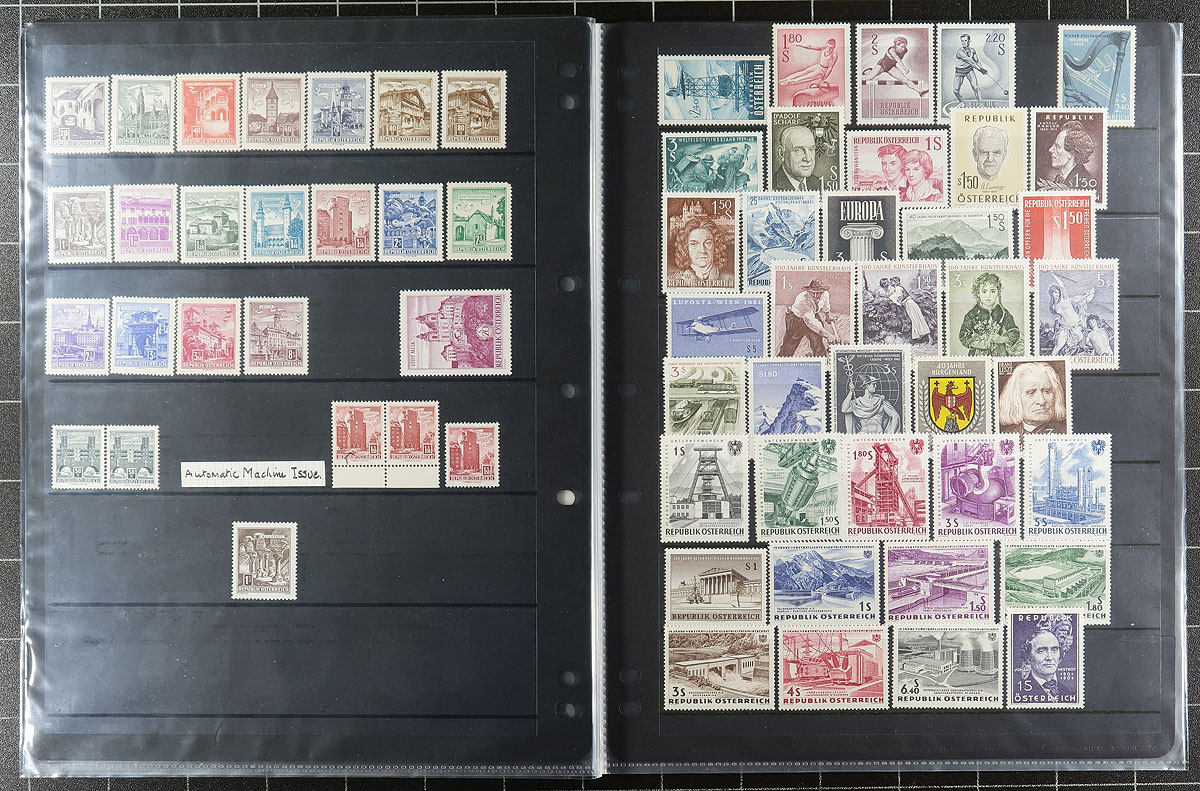 Collection / accumulation of mint Austria, 1918-1993, containing roughly 1,200 stamps in several stock pages. The lot generally ranges from Scott #181/1632, noting several sets (some in 102 cards), and selections of back of the book material. Owner's 2010 Scott catalogue value for the lot totals US$592.00 ($799.20 CDN). A nice starter group for the Austria or worldwide collector, some mild duplication for some issues, overall very fine. Estimate =
