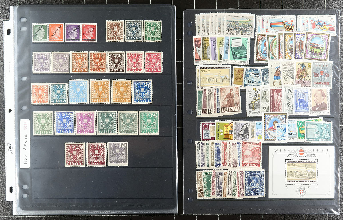 Collection / accumulation of mint Austria, 1918-1993, containing roughly 1,200 stamps in several stock pages. The lot generally ranges from Scott #181/1632, noting several sets (some in 102 cards), and selections of back of the book material. Owner's 2010 Scott catalogue value for the lot totals US$592.00 ($799.20 CDN). A nice starter group for the Austria or worldwide collector, some mild duplication for some issues, overall very fine. Estimate =