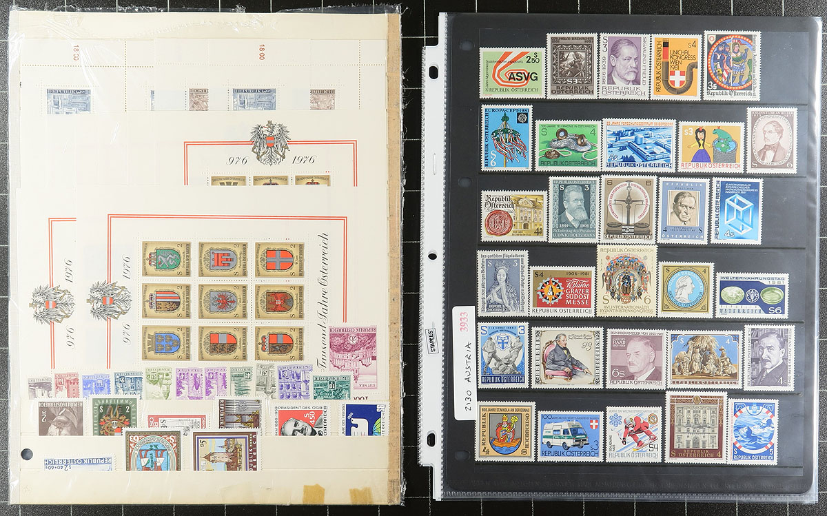 Collection / accumulation of mint Austria, 1918-1993, containing roughly 1,200 stamps in several stock pages. The lot generally ranges from Scott #181/1632, noting several sets (some in 102 cards), and selections of back of the book material. Owner's 2010 Scott catalogue value for the lot totals US$592.00 ($799.20 CDN). A nice starter group for the Austria or worldwide collector, some mild duplication for some issues, overall very fine. Estimate =