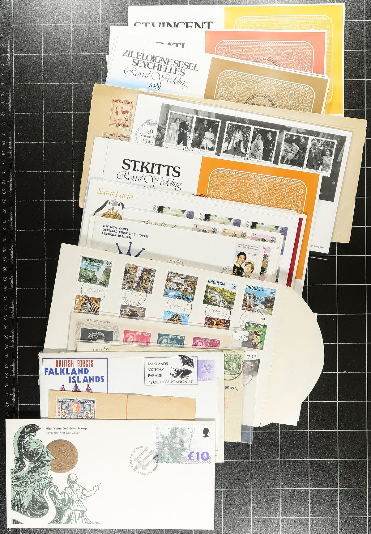 Attractive group of roughly 300 covers, 1930's-2000's, primarily containing first day or commemorative covers, noting several larger sized envelopes with souvenir sheet frankings, along with singles and set frankings, noting better representation from Great Britain, British Virgin Islands, New Zealand, just to name a few. A lovely lot for thematic and topical collectors as we encountered several suitable subjects including birds, royalty, transportation, ships, and more. Estimate =