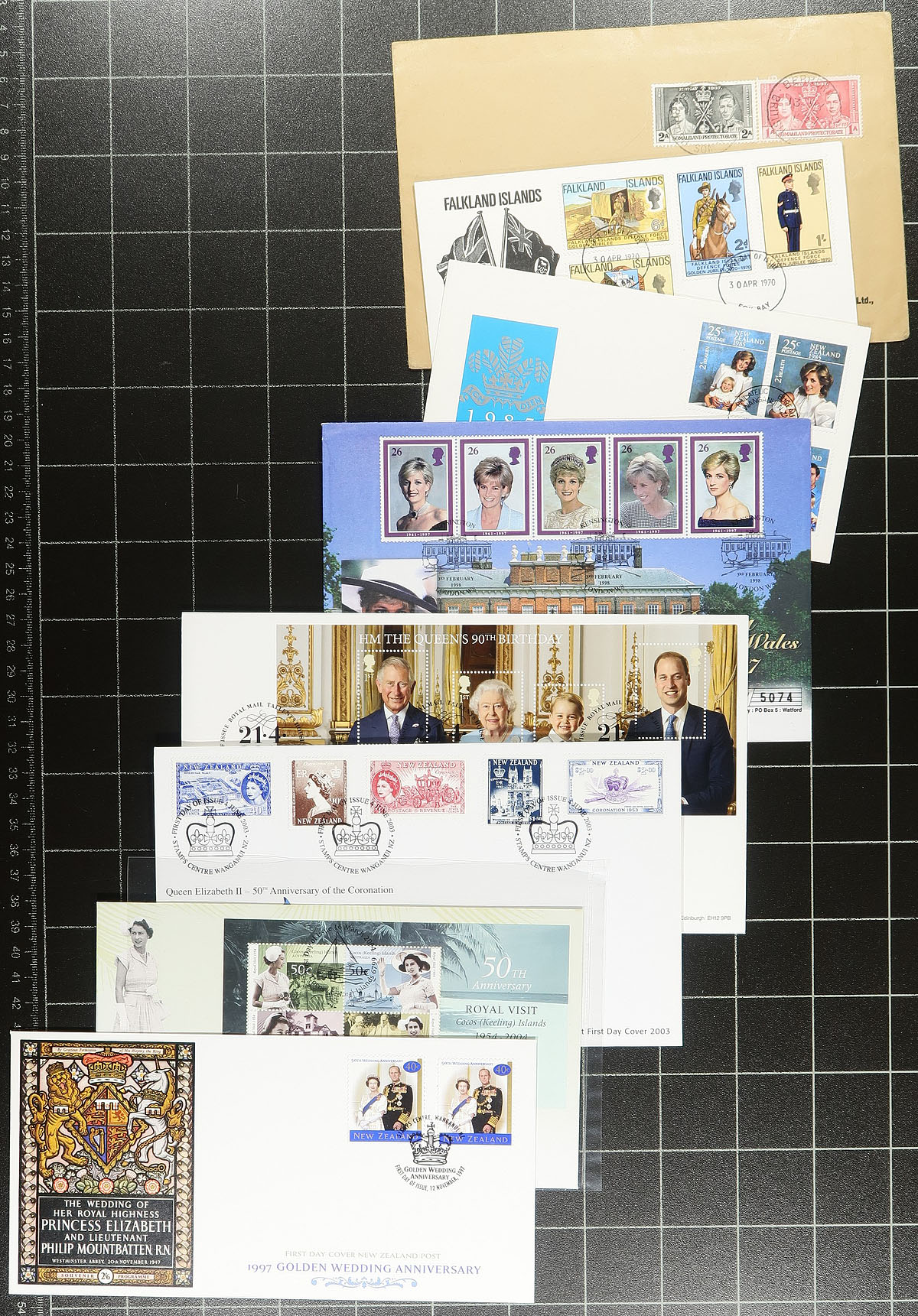 Attractive group of roughly 300 covers, 1930's-2000's, primarily containing first day or commemorative covers, noting several larger sized envelopes with souvenir sheet frankings, along with singles and set frankings, noting better representation from Great Britain, British Virgin Islands, New Zealand, just to name a few. A lovely lot for thematic and topical collectors as we encountered several suitable subjects including birds, royalty, transportation, ships, and more. Estimate =