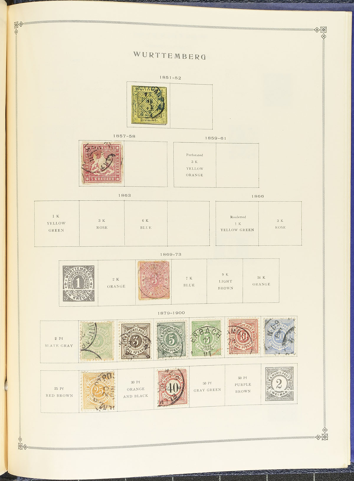 Nice collection of mint and used worldwide stamps in a very fresh Scott International album (volume 1 spaces from 1840 to 1940), with slipcase. The collection contains many hundreds of stamps scattered throughout, with definite strength with Germany and States, along with European countries, some South America and British Commonwealth. The stamps range from the 1850's to 1940, with strength from the 1870's to the 1930's, with a spot check indicating some stamps cataloguing $15 and up. A lovely album, as fresh as the day it was printed, and should be filled up with similar quality material, overall fine to very fine. Estimate =