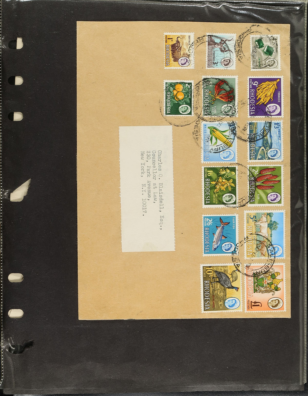 Lovely collection of Rhodesia and area first day covers, 1930's-1978, containing 80 covers, primarily from Rhodesia, along with a few other regions that are now in South Africa, noting singles and sets frankings. We note a few sets cataloguing $10 and up, with a Scott catalogue value for the collection totaling US$351.00 (counted as used stamps). A lovely lot for thematic and topical collectors as well as we spotted many suitable subjects including birds and other animals, transportation, royalty, butterflies, and more. A lovely lot that should prove popular to all collectors. Estimate =
