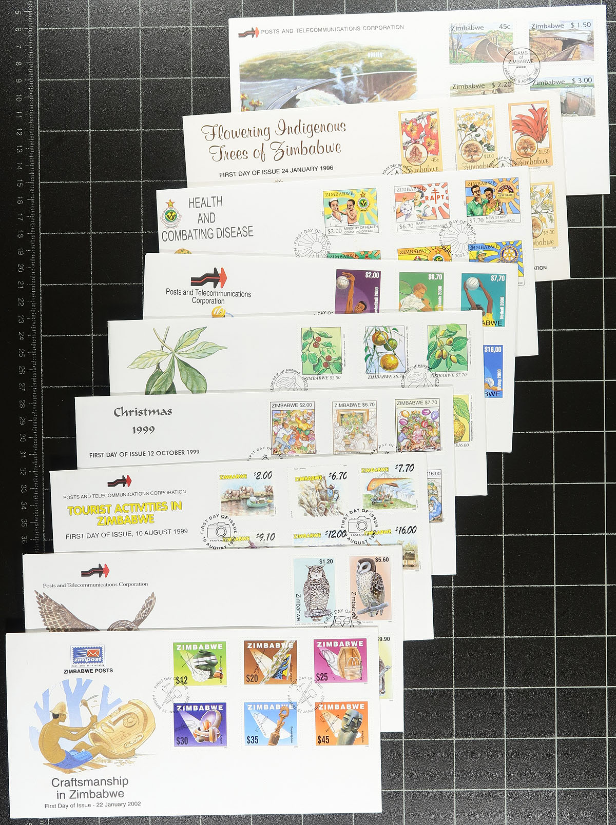 Nice collection of Zimbabwe first day covers, 1980-2000, containing roughly 125 covers noting primarily set frankings. Scott 2026 catalogue value for the stamps totals US$486.00. A lovely lot for topical and thematic collectors as we note a variety of good subjects including birds, scenic views, animals, flowers, and much more. A few covers have bent corners, overall a very nice lot. Estimate =