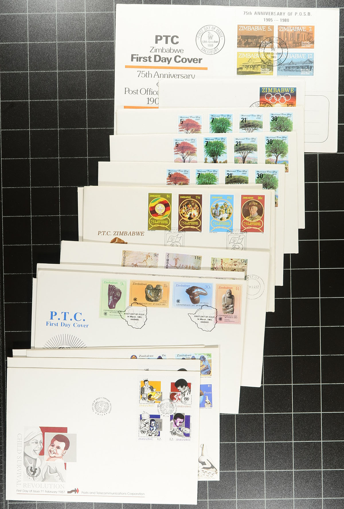 Nice collection of Zimbabwe first day covers, 1980-2000, containing roughly 125 covers noting primarily set frankings. Scott 2026 catalogue value for the stamps totals US$486.00. A lovely lot for topical and thematic collectors as we note a variety of good subjects including birds, scenic views, animals, flowers, and much more. A few covers have bent corners, overall a very nice lot. Estimate =
