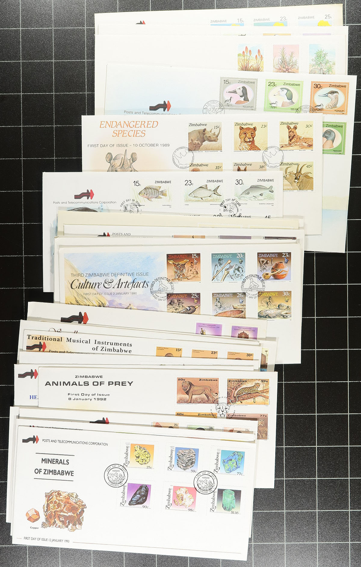 Nice collection of Zimbabwe first day covers, 1980-2000, containing roughly 125 covers noting primarily set frankings. Scott 2026 catalogue value for the stamps totals US$486.00. A lovely lot for topical and thematic collectors as we note a variety of good subjects including birds, scenic views, animals, flowers, and much more. A few covers have bent corners, overall a very nice lot. Estimate =