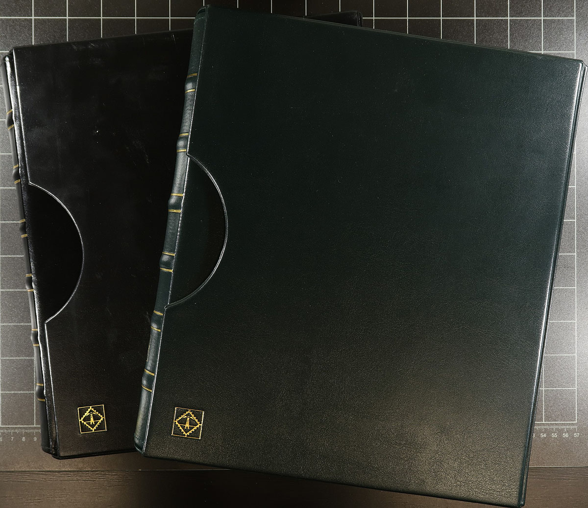 Lovely group of 6 Lighthouse binders and a stockbook. The Lighthouse binders are 4 ring, except the black binder which is 3 ring, four of which have slipcases, along with a Lighthouse stockbook (black pages), with slipcase. The lot also includes roughly 75 mostly double sided Vario-style stock pages (mostly 2-row, ideal for covers). A lovely lot in very gently used condition, which would retail several hundreds of dollars. Estimate =