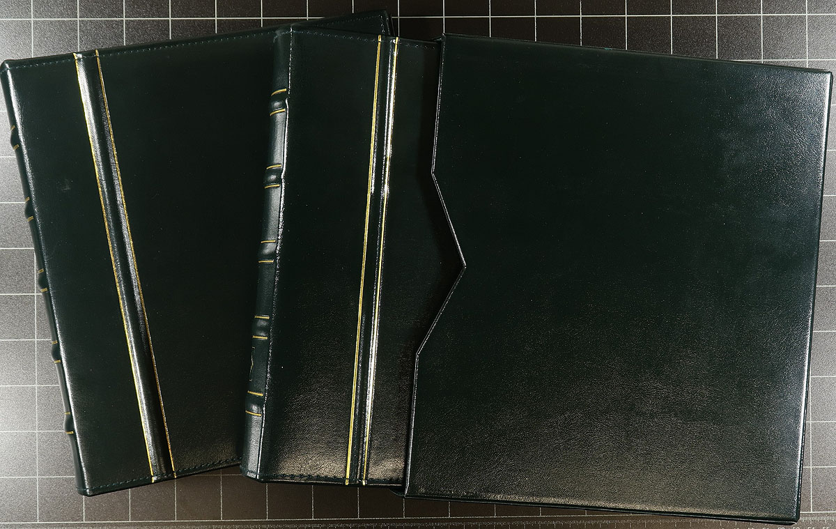 Lovely group of 6 Lighthouse binders and a stockbook. The Lighthouse binders are 4 ring, except the black binder which is 3 ring, four of which have slipcases, along with a Lighthouse stockbook (black pages), with slipcase. The lot also includes roughly 75 mostly double sided Vario-style stock pages (mostly 2-row, ideal for covers). A lovely lot in very gently used condition, which would retail several hundreds of dollars. Estimate =