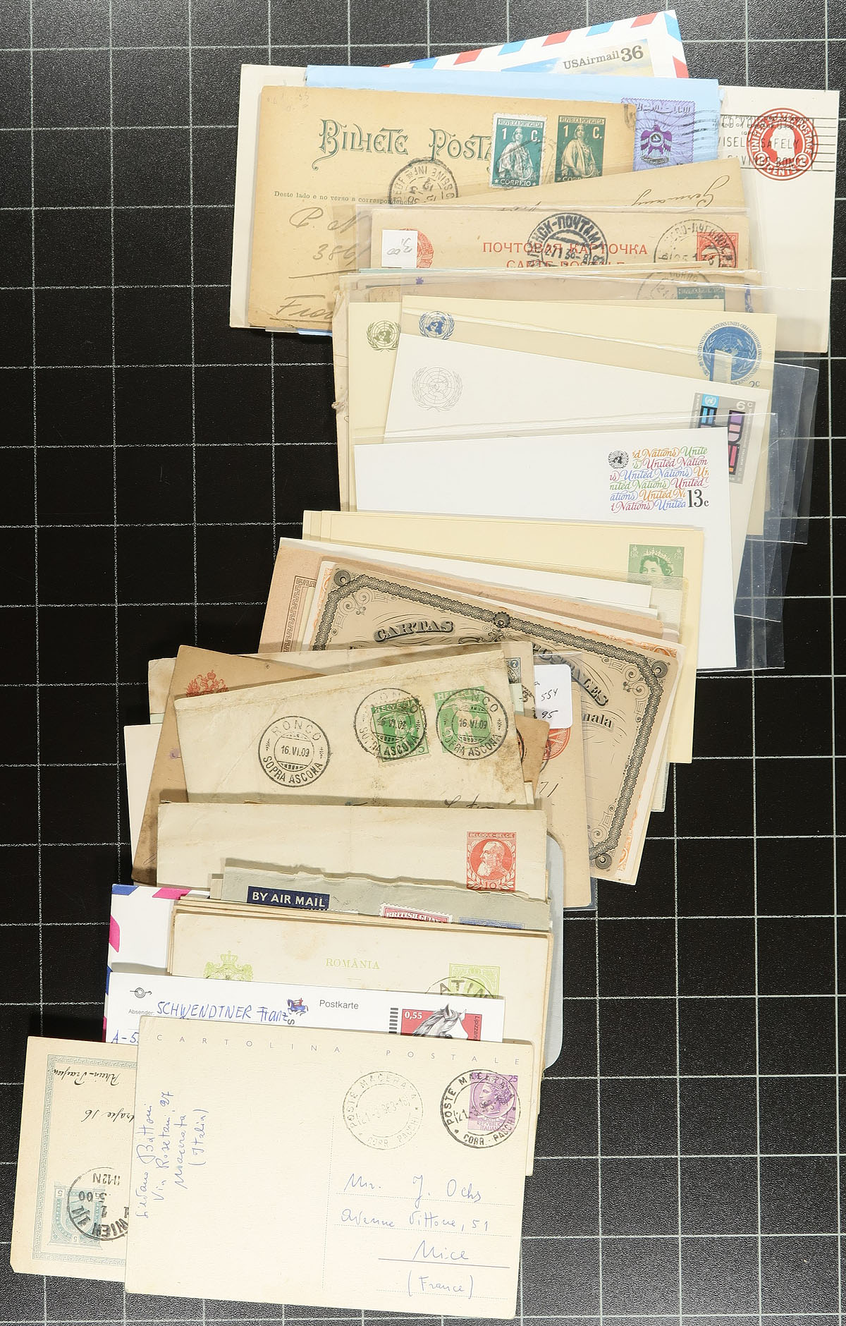 Nice accumulation of used and unused worldwide postal stationery, 1890's-1980's, containing roughly 275 items loose in a box. A cursory check indicated a wide variety of items including wrappers, UPU cards, postal cards, reply cards, letter cards, registered envelopes, several air letters (including a few illustrated), and more. Better representation from the United Nations, Great Britain, Vatican, along with European and Commonwealth countries, with some material priced at $2 to $5 each. A nice lot for the postal stationery specialist, overall fine to very fine. Estimate =