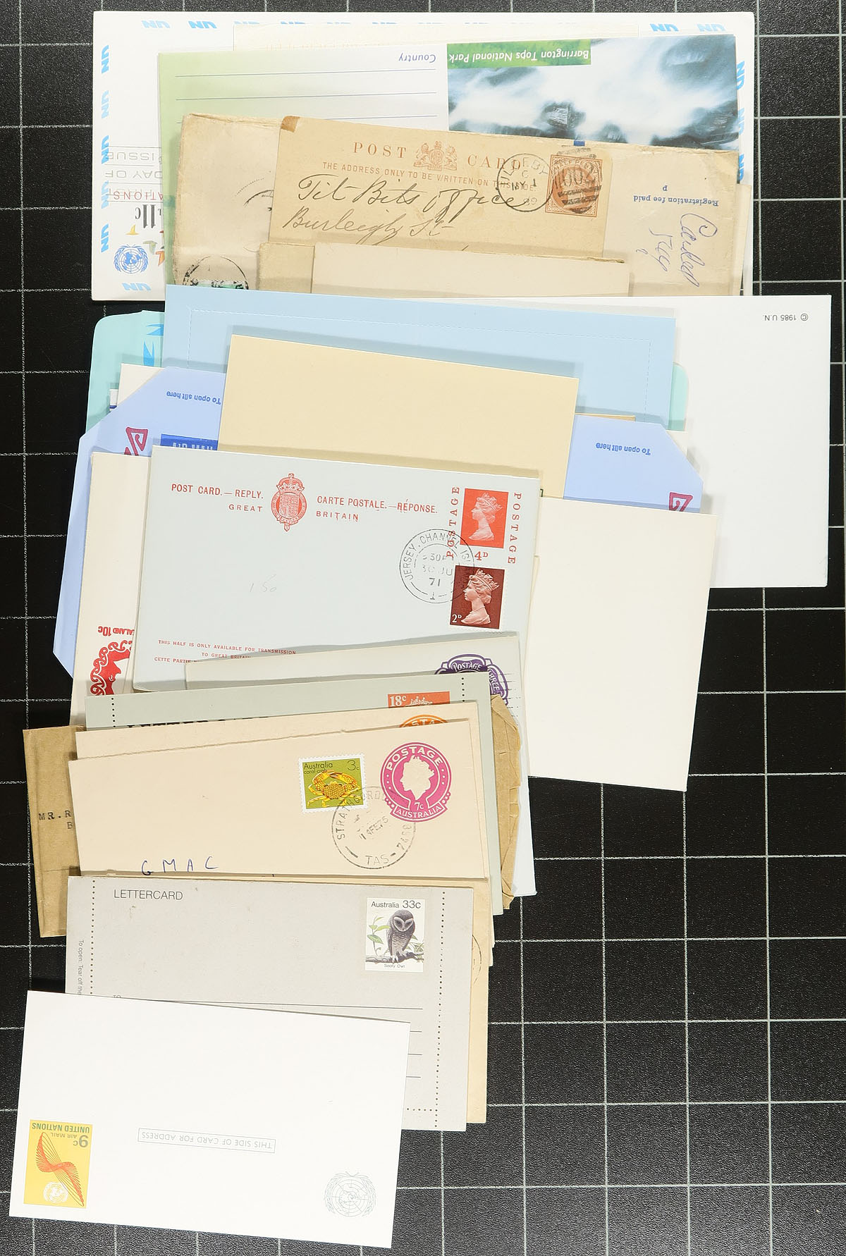 Nice accumulation of used and unused worldwide postal stationery, 1890's-1980's, containing roughly 275 items loose in a box. A cursory check indicated a wide variety of items including wrappers, UPU cards, postal cards, reply cards, letter cards, registered envelopes, several air letters (including a few illustrated), and more. Better representation from the United Nations, Great Britain, Vatican, along with European and Commonwealth countries, with some material priced at $2 to $5 each. A nice lot for the postal stationery specialist, overall fine to very fine. Estimate =