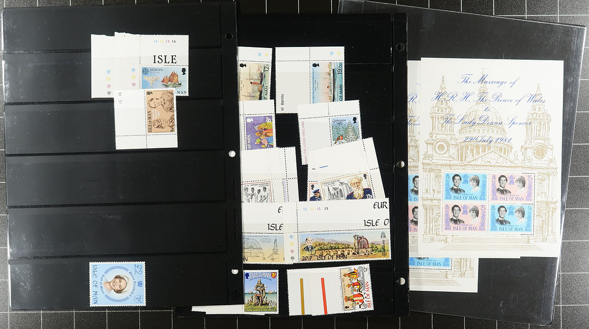 Lovely collection of primarily never hinged Isle of Man, 1973-1994, containing roughly 1,250 stamps in an album and binder. The album contains 770 stamps, neatly organized in White Ace hingeless pages, ranging from Scott #12/622, including souvenir sheets and booklets, with the binder containing roughly 500 stamps in stock pages, ranging from Scott #12/245, including singles, gutter pairs, souvenir sheets, and more. A nice clean lot for collectors and dealers alike. 2026 Scott US$732.00 =