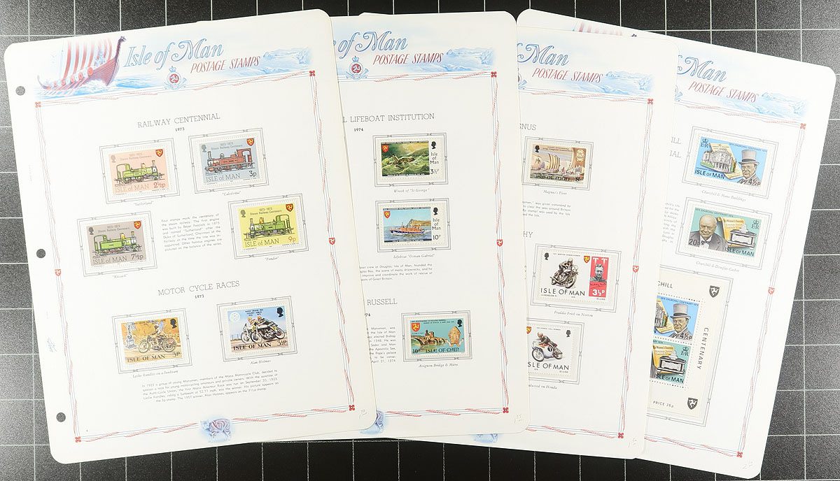 Lovely collection of primarily never hinged Isle of Man, 1973-1994, containing roughly 1,250 stamps in an album and binder. The album contains 770 stamps, neatly organized in White Ace hingeless pages, ranging from Scott #12/622, including souvenir sheets and booklets, with the binder containing roughly 500 stamps in stock pages, ranging from Scott #12/245, including singles, gutter pairs, souvenir sheets, and more. A nice clean lot for collectors and dealers alike. 2026 Scott US$732.00 =