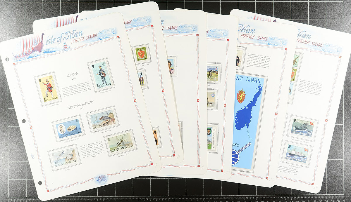 Lovely collection of primarily never hinged Isle of Man, 1973-1994, containing roughly 1,250 stamps in an album and binder. The album contains 770 stamps, neatly organized in White Ace hingeless pages, ranging from Scott #12/622, including souvenir sheets and booklets, with the binder containing roughly 500 stamps in stock pages, ranging from Scott #12/245, including singles, gutter pairs, souvenir sheets, and more. A nice clean lot for collectors and dealers alike. 2026 Scott US$732.00 =