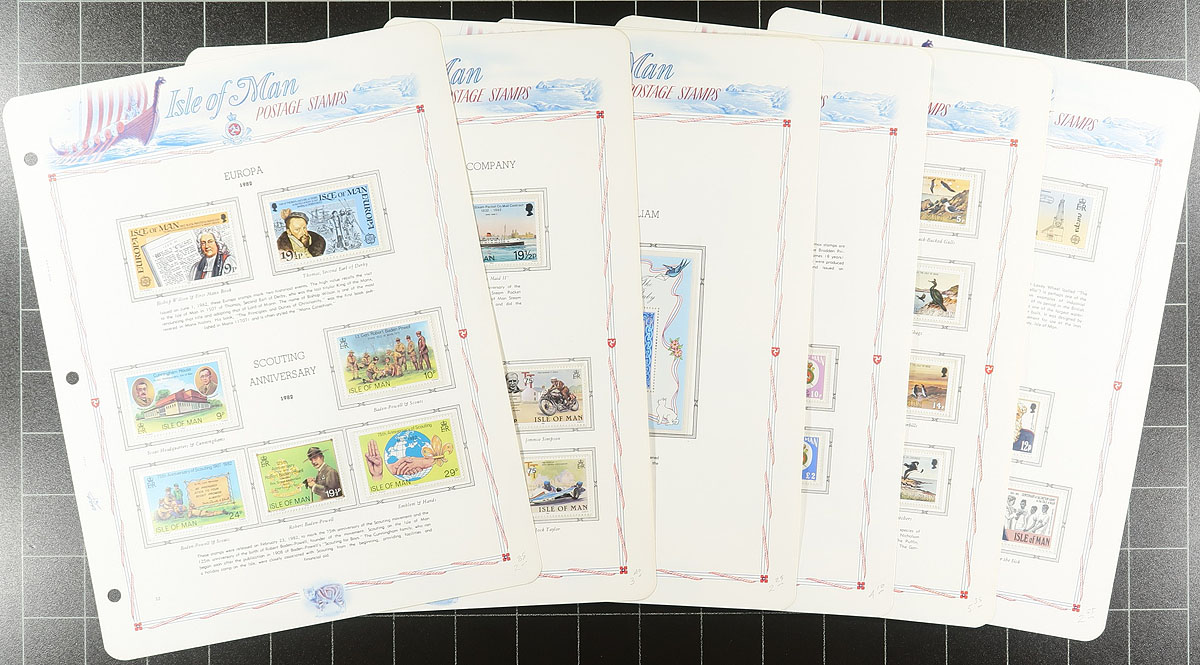 Lovely collection of primarily never hinged Isle of Man, 1973-1994, containing roughly 1,250 stamps in an album and binder. The album contains 770 stamps, neatly organized in White Ace hingeless pages, ranging from Scott #12/622, including souvenir sheets and booklets, with the binder containing roughly 500 stamps in stock pages, ranging from Scott #12/245, including singles, gutter pairs, souvenir sheets, and more. A nice clean lot for collectors and dealers alike. 2026 Scott US$732.00 =