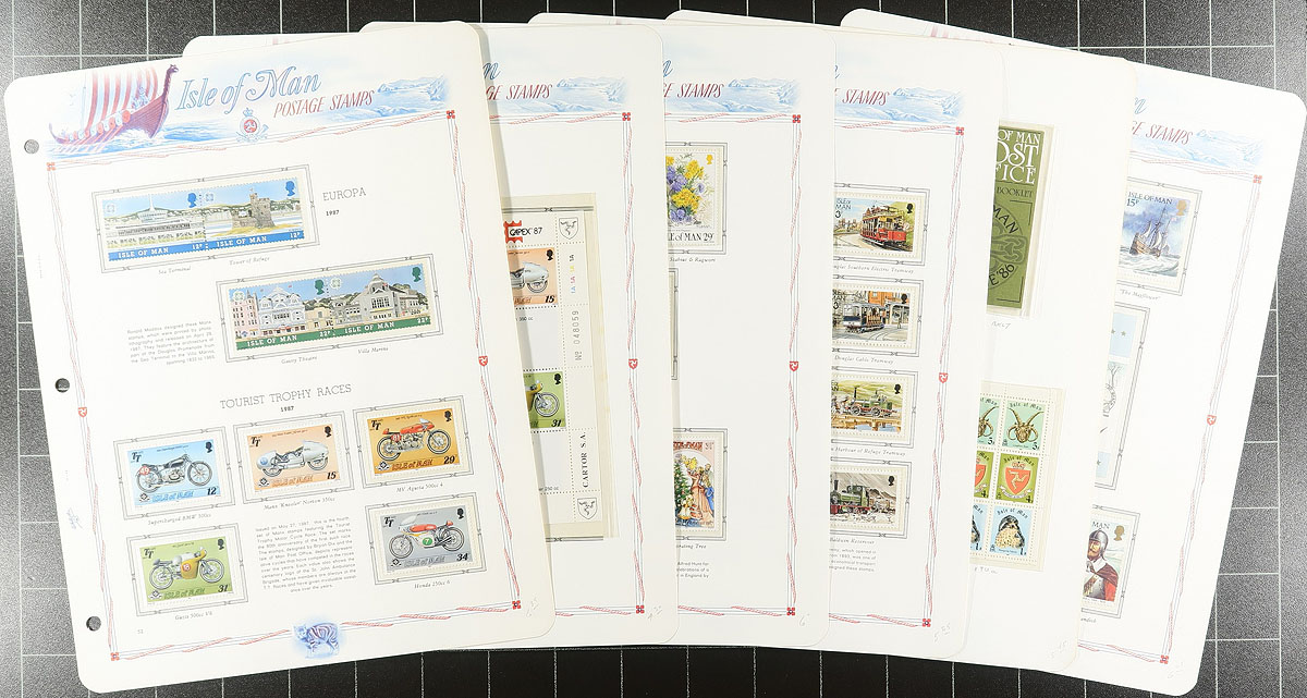 Lovely collection of primarily never hinged Isle of Man, 1973-1994, containing roughly 1,250 stamps in an album and binder. The album contains 770 stamps, neatly organized in White Ace hingeless pages, ranging from Scott #12/622, including souvenir sheets and booklets, with the binder containing roughly 500 stamps in stock pages, ranging from Scott #12/245, including singles, gutter pairs, souvenir sheets, and more. A nice clean lot for collectors and dealers alike. 2026 Scott US$732.00 =