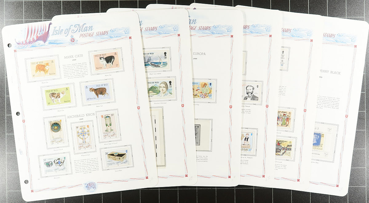 Lovely collection of primarily never hinged Isle of Man, 1973-1994, containing roughly 1,250 stamps in an album and binder. The album contains 770 stamps, neatly organized in White Ace hingeless pages, ranging from Scott #12/622, including souvenir sheets and booklets, with the binder containing roughly 500 stamps in stock pages, ranging from Scott #12/245, including singles, gutter pairs, souvenir sheets, and more. A nice clean lot for collectors and dealers alike. 2026 Scott US$732.00 =